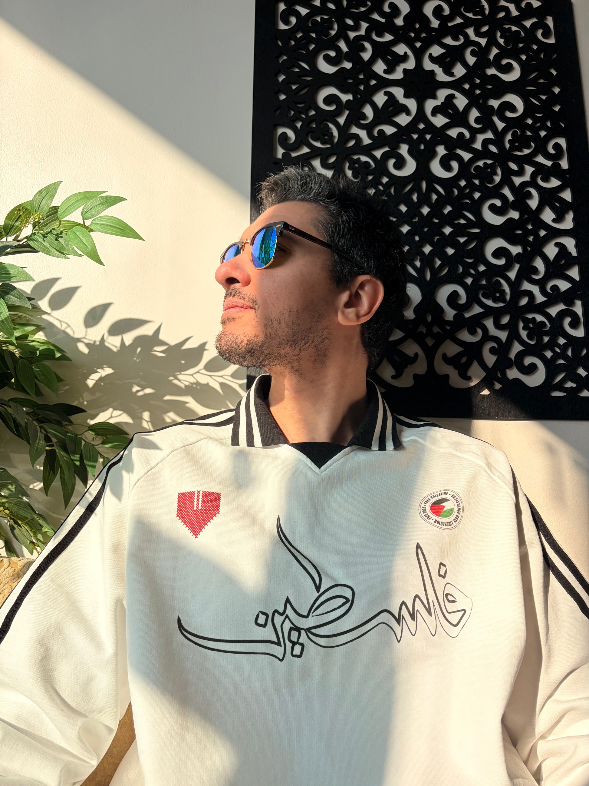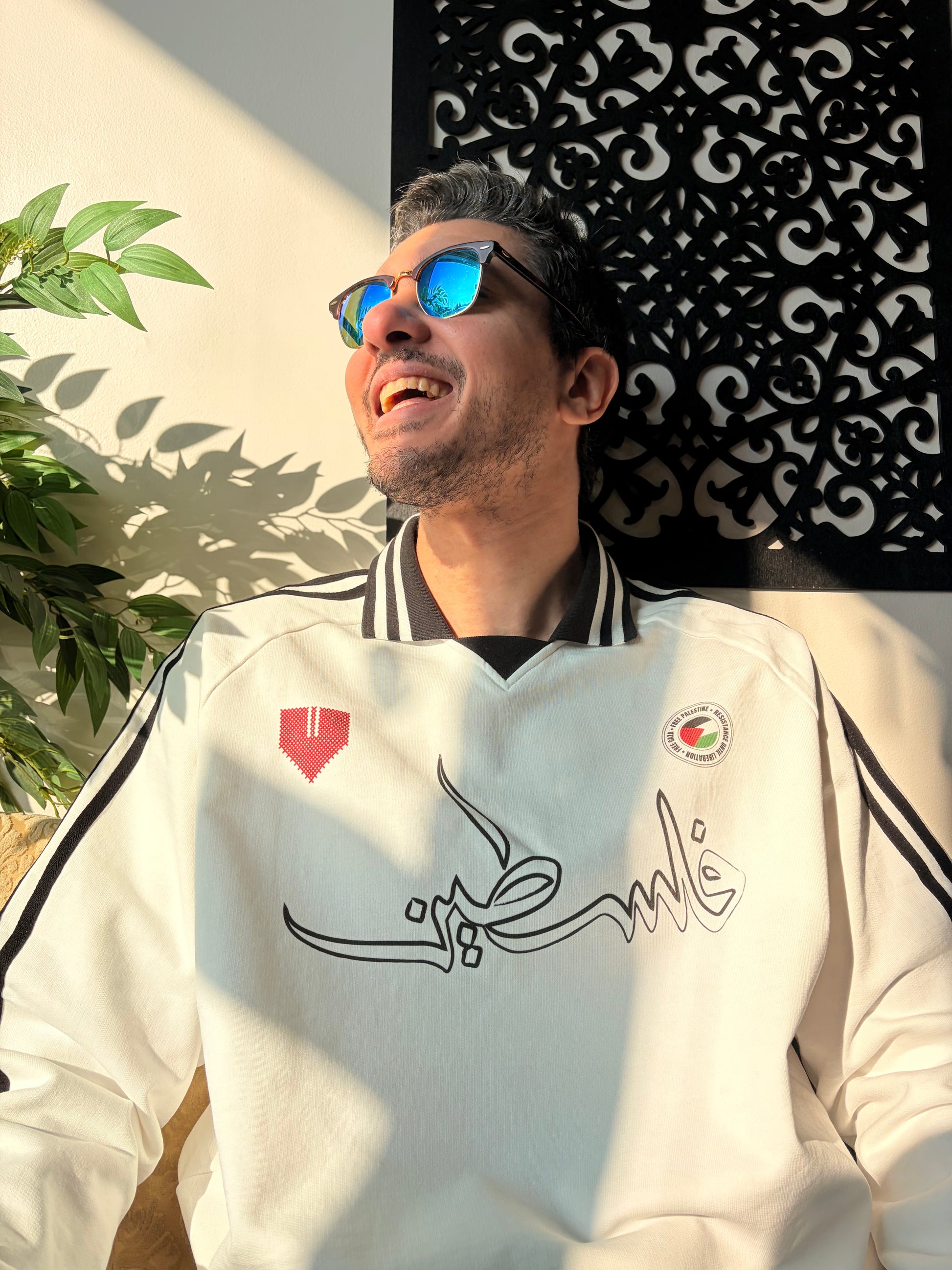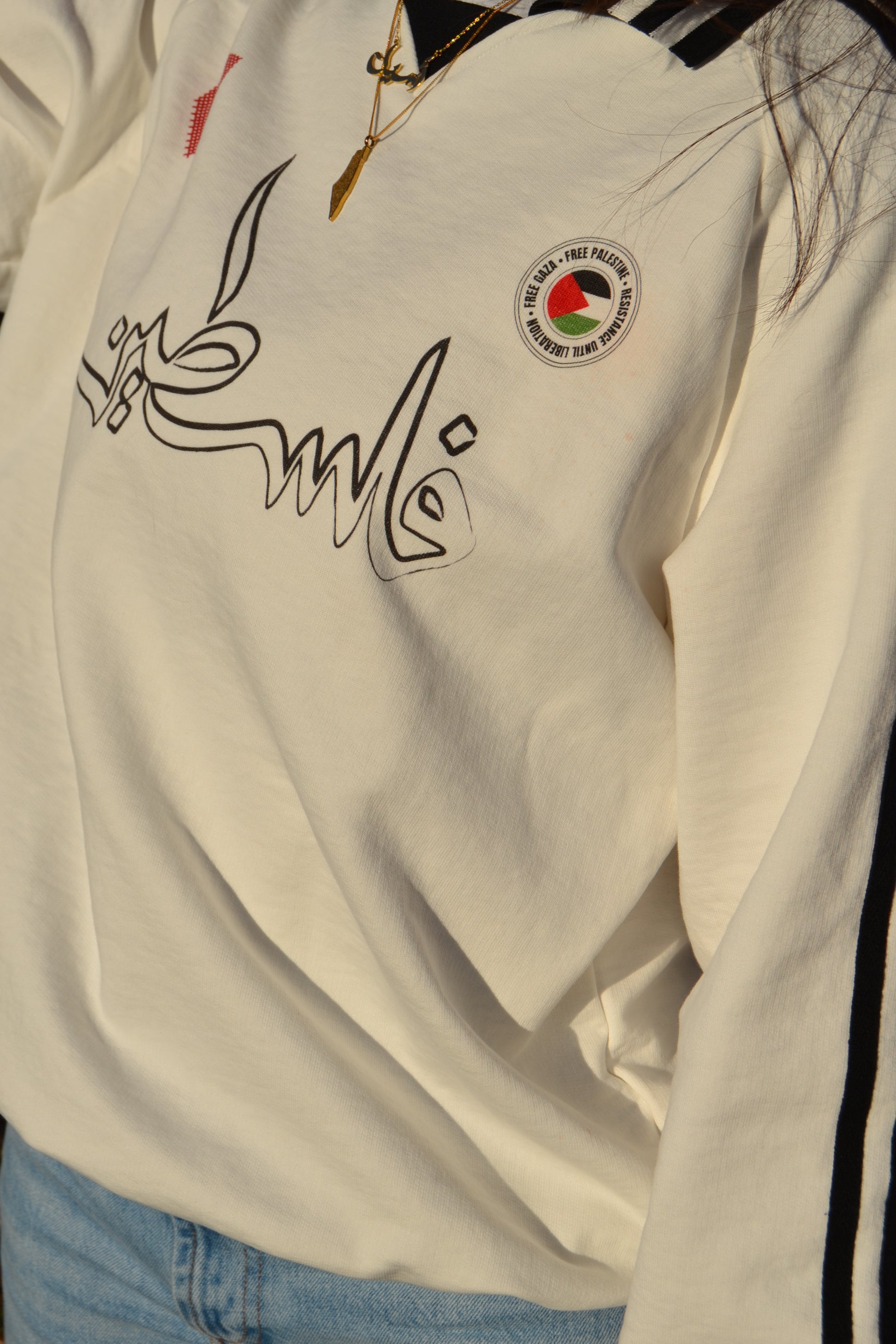 Mukawama Crewneck, features Palestine in Arabic Lettering, Stamp with the Palestinian Flag, and a printed tatreez heart motif.