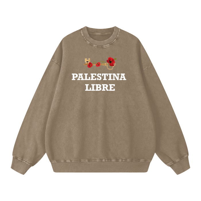 A soft, cotton Acid Wash Oversize Sweatshirt featuring original illustration of mine. Palestine Libre with the key of return.