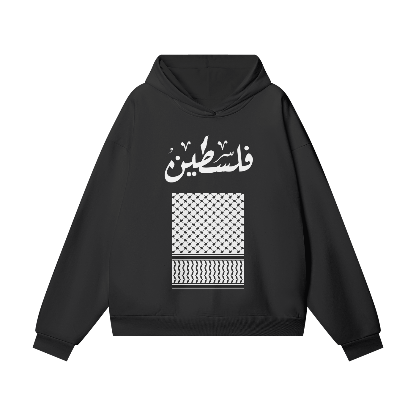 Premium Oversized Heavyweight Hidden Pocket Fleece Hoodie | Unisex | featuring an original illustration of mine. Arabic text that reads "Palestine" from the front and "Gaza" from the back. T-shirt also has a keffiyeh print on the front.