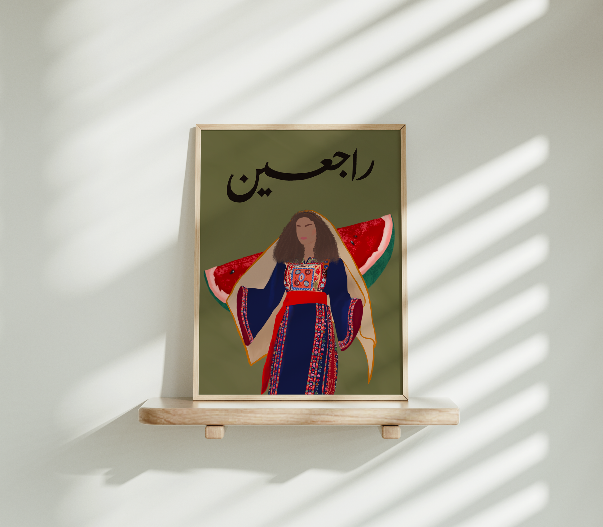 Rajeen " Coming back" Watermelon Palestinian Thoub Art Print is a high quality print of a digital illustration of mine showcasing small details of the different wild flowers of Palestine and the Watermelon. This poster is a representation of Palestinian beauty.