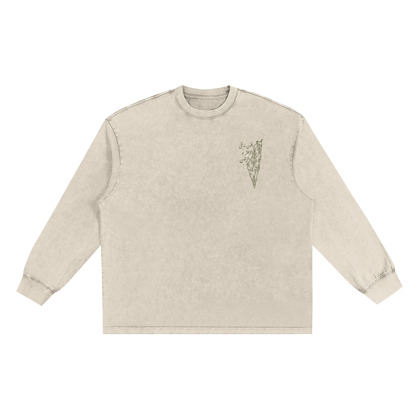 A soft, light stretchy, cotton oversized beige t-shirt featuring an original illustration of mine. Tshirt reads: "باقون ما بقي