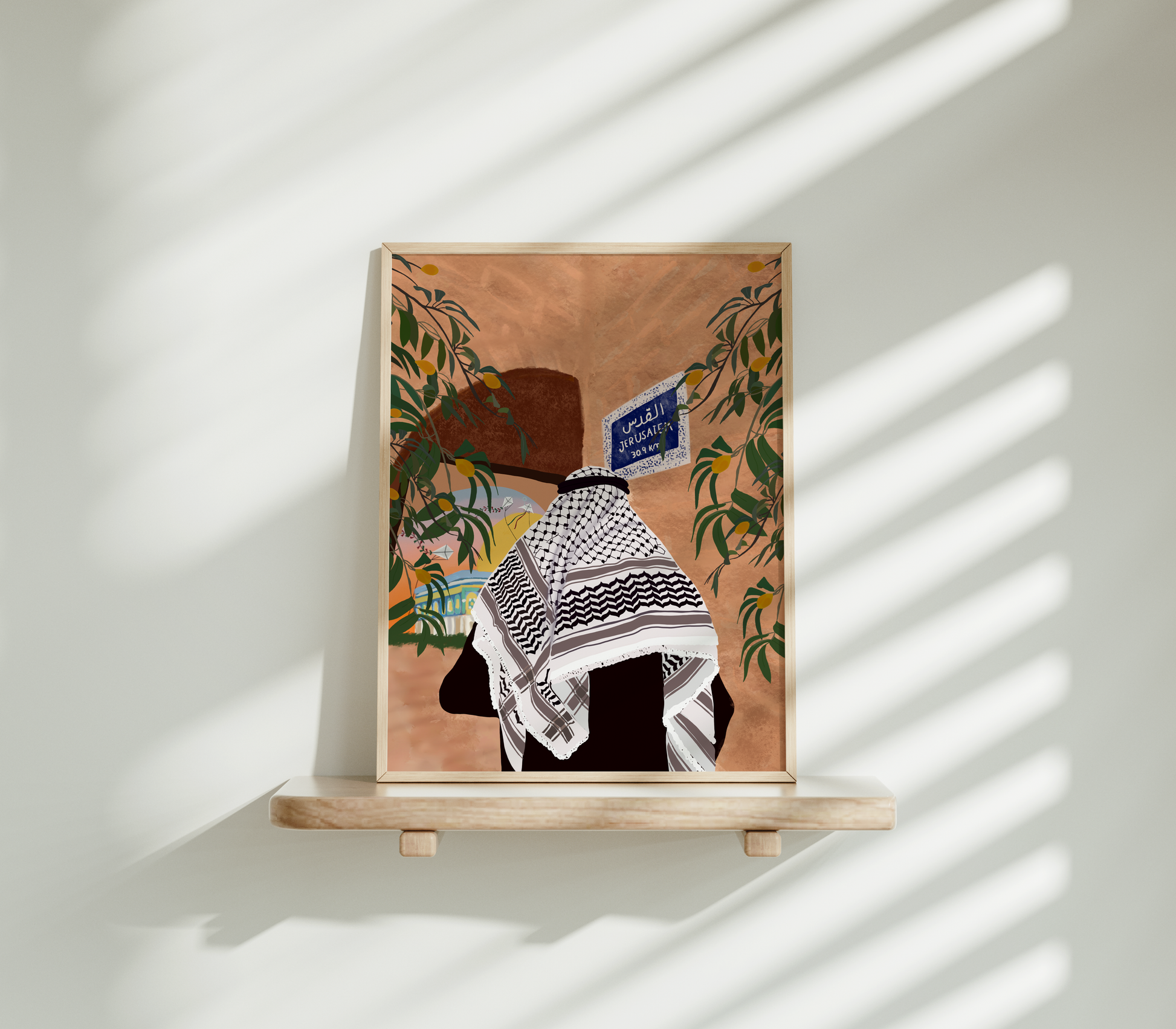 Seedo's Jerusalem Art Print is a high quality print of a digital illustration of mine showcasing small details of The Dome of the Rock with kites in the sky, referencing Refaat Alareer's poem. The art also includes olive branches and the kufiya. This poster is a perfect combination of Palestinian tradition and history. • Matte Finish • Giclée print for Bright and intense colors for your desired design that will not fade when exposed to sunlight regularly • Prints are hand rolled in protective tissue paper and shipped in a extra thick triangle boxes or tubes. Boxes will be used for posters smaller than 24'', and tubes will be used for all sizes 24'' and above. EU representative: HONSON VENTURES LIMITED, gpsr@honsonventures.com, 3, Gnaftis House flat 102, Limassol, Mesa Geitonia, 4003, CY Product information: Generic brand, 2 year warranty in EU and Northern Ireland as per Directive 1999/44/EC Care instructions: If the print does gather any dust, you may wipe it off gently with a clean, dry cloth.