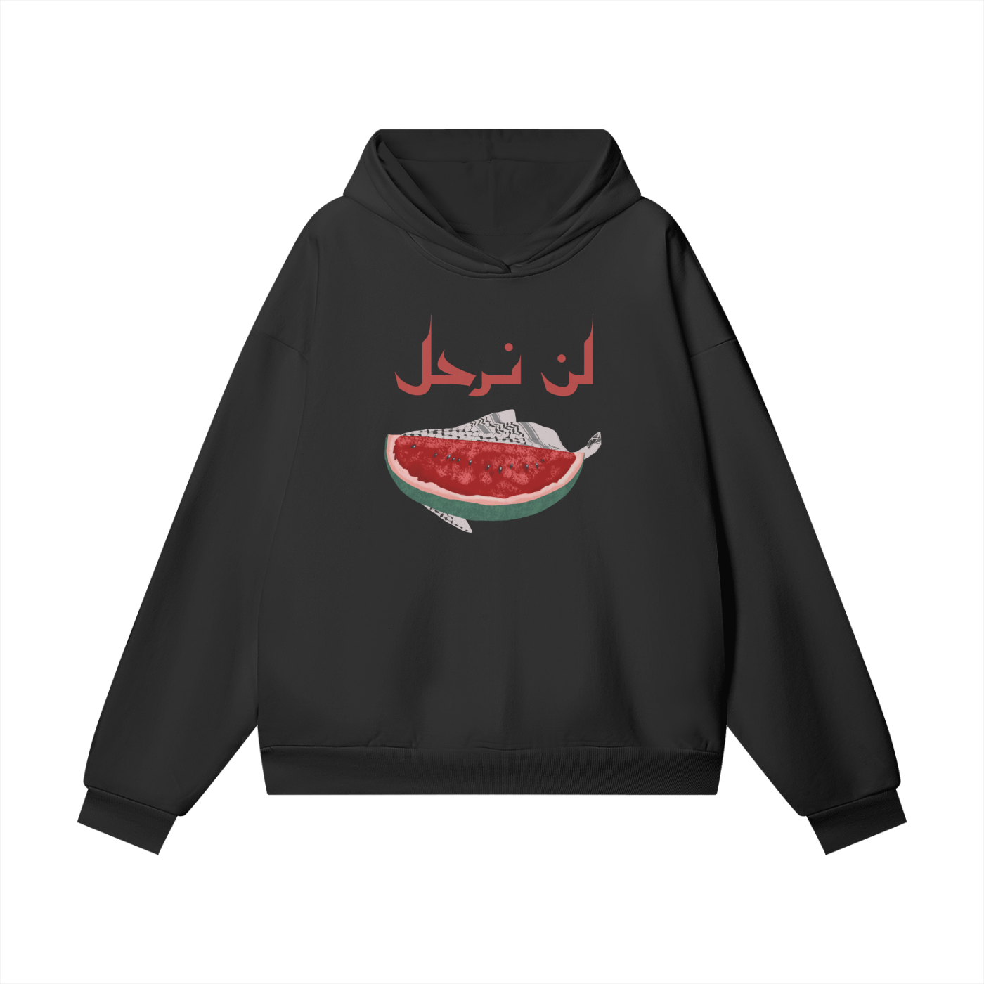 Premium Oversized Heavyweight Hidden Pocket Fleece Hoodie | Unisex | featuring an original illustration of mine. Hoodie reads: "We won't leave" in the front and in the back it says, "A generation that doesn’t know how to forget". Signifying the importance of our fight for liberation. While exhibiting the watermelon hand drawn illustration along with the kuffiya.